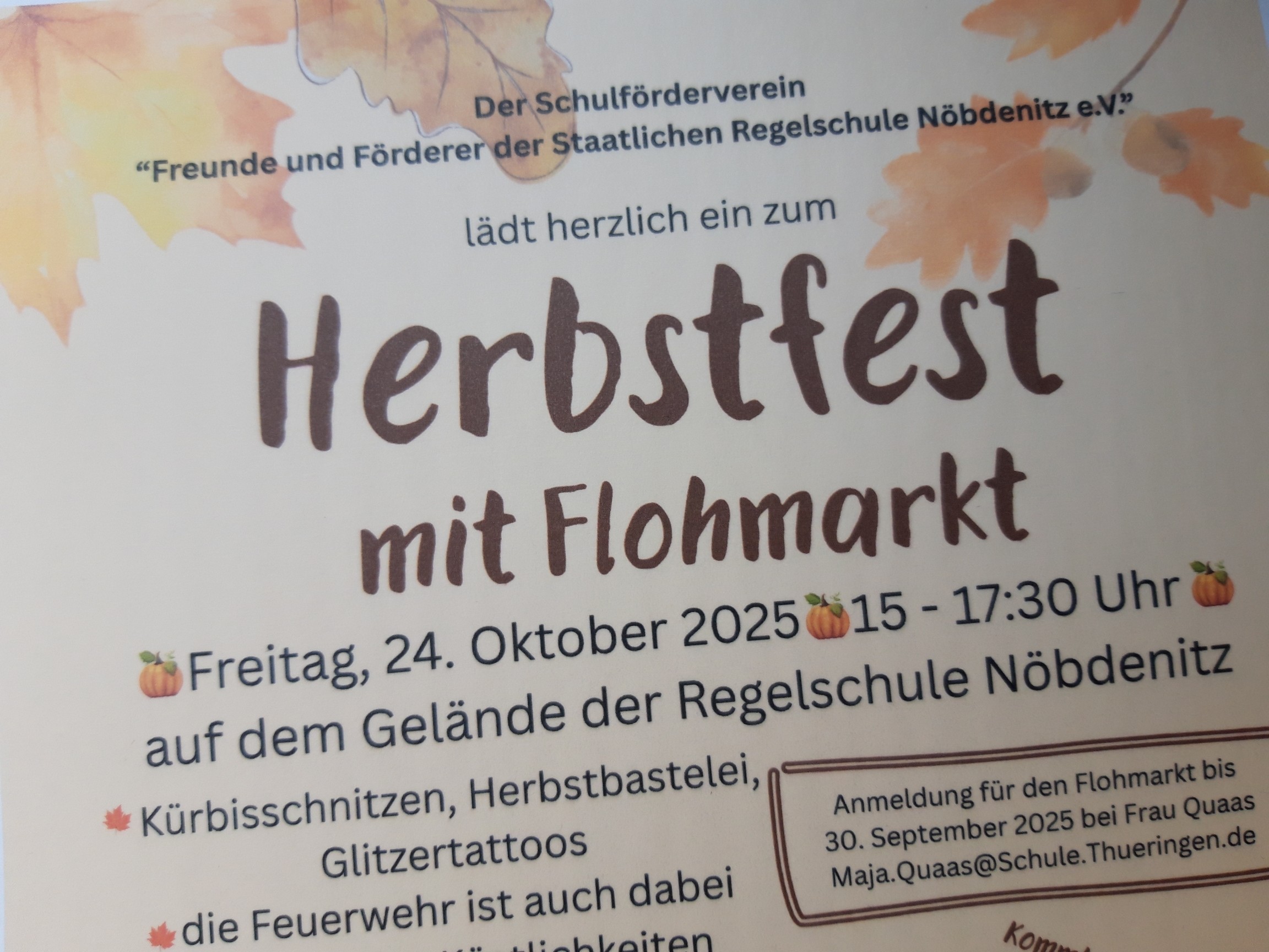 Der Schulförderverein „Freunde und Förderer der Staatlichen Regelschule Nöbdenitz e.V.“ lädt herzlich zum Herbstfest mit Flohmarkt, das am Freitag, 24. Oktober 2025, 15-17:30 Uhr, auf dem Gelände der Regelschule Nöbdenitz stattfindet.